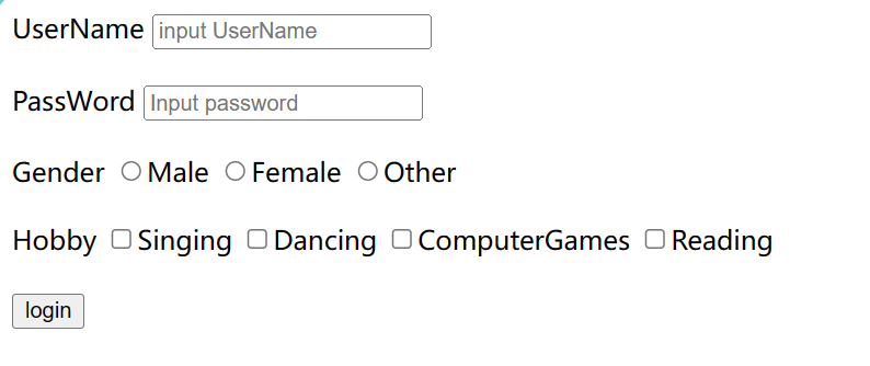 <label for="">Gender</label> <input type="radio" name="Gender">Male <input type="radio" name="Gender">Female <input type="radio" name="Gender">Other <br><br> <label for="">Hobby</label> <input type="checkbox" name="Hobby">Singing <input type="checkbox" name="Hobby">Dancing <input type="checkbox" name="Hobby">ComputerGames <input type="checkbox" name="Hobby">Reading <br><br> <input type="submit" value="login"> </form> </body> </html>