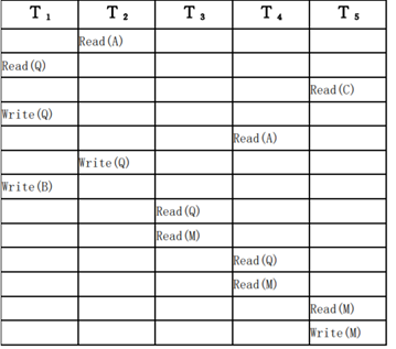 4、在数据库系统中有如下一个调度 S,它涉及到 5 个不同的事务 T1、T2、T3、T4 和 T5。 判断调度 S 是否为冲突可串行化。如果调度 S 是冲突可串行化的,就请给出与之等价的一 个串行调度序列。